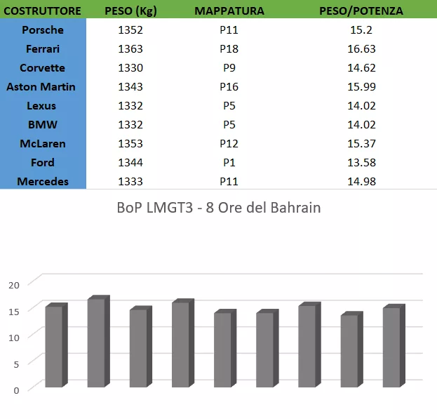 Dal BoP pubblicato da FIA e ACO, le Ferrari 296 LMGT3 restano le più penalizzate sia nel peso che nella potenza disponibile dal motore (P18). Porsche peserà (di base) 11 Kg in meno, che con il Success Handicap diventano 19 Kg di differenza tra le due contendenti al Titolo (la #21 decisamente la più pesante). Oltre che alle due vetture nelle prime posizioni in classifica, il Success Handicap si applica anche sulla #81 (vincitrice al Fuji e terza nella classifica), aggiungendo alla Corvette terza nella classifica ben 24 Kg.