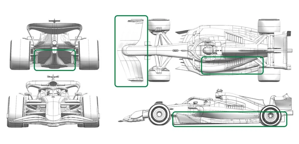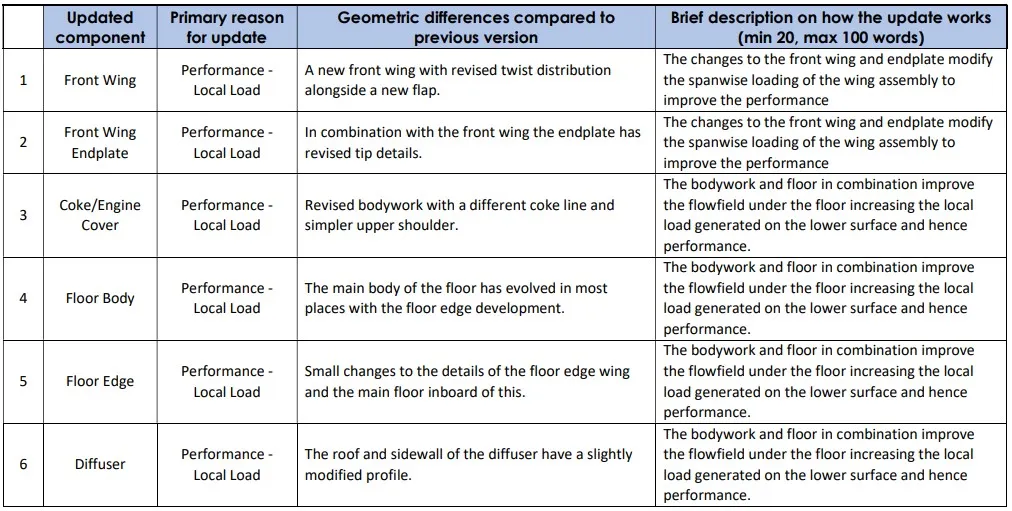 Le novità più vistose, come mostrano le illustrazioni in alto, si trovano nella zona centrale, dove è stata pesantemente rivista l’area della copertura del motore, che ora presenta degli svasi molto più in linea con quelli della McLaren MCL38. La linea, in generale, sembra essere più semplificata, svelando la necessità di pulire i flussi per renderli meno turbolenti e incanalarli verso la zona posteriore, dove è presente la beam wing.