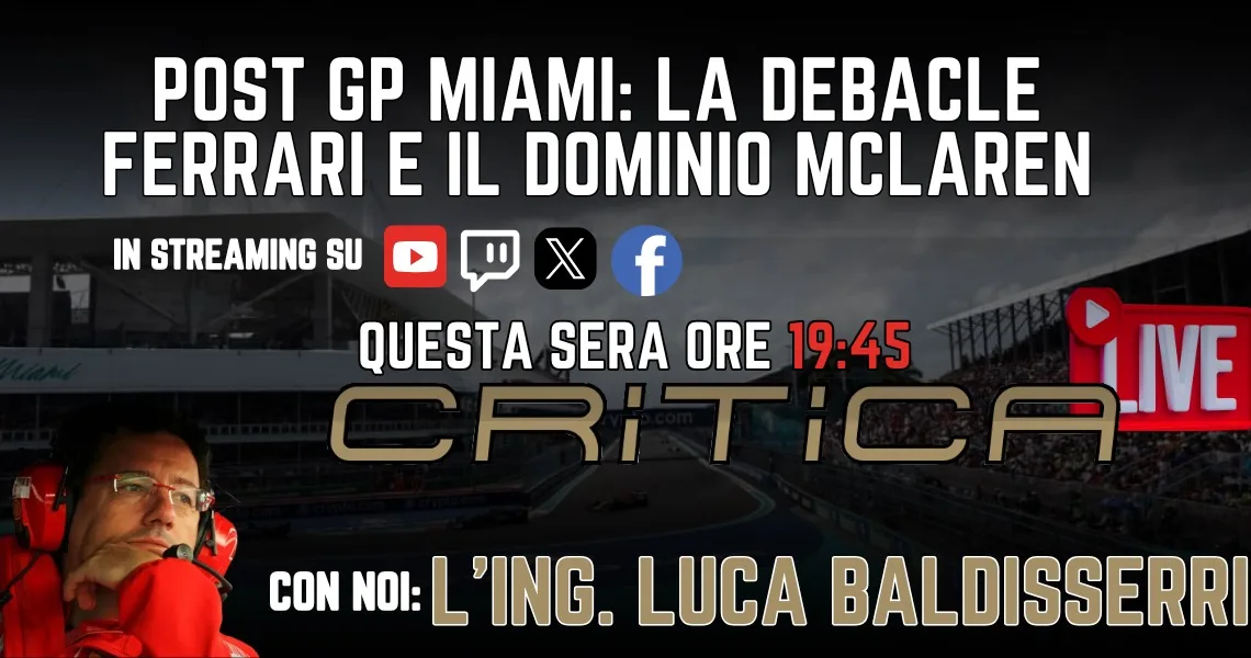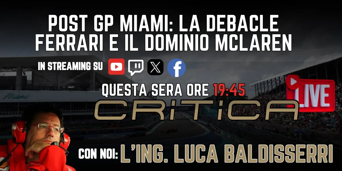 Stasera, martedì 6 maggio, eccezionalmente alle 19:45, su CriticaLive, proveremo a capirci qualcosa con uno che di Ferrari ne ha vissuta (e aggiustata) parecchia: l’ing. Luca Baldisserri, ospite speciale della serata. Con lui parleremo di errori in pista, problemi di gestione, strategie confuse e, ovviamente, del futuro.