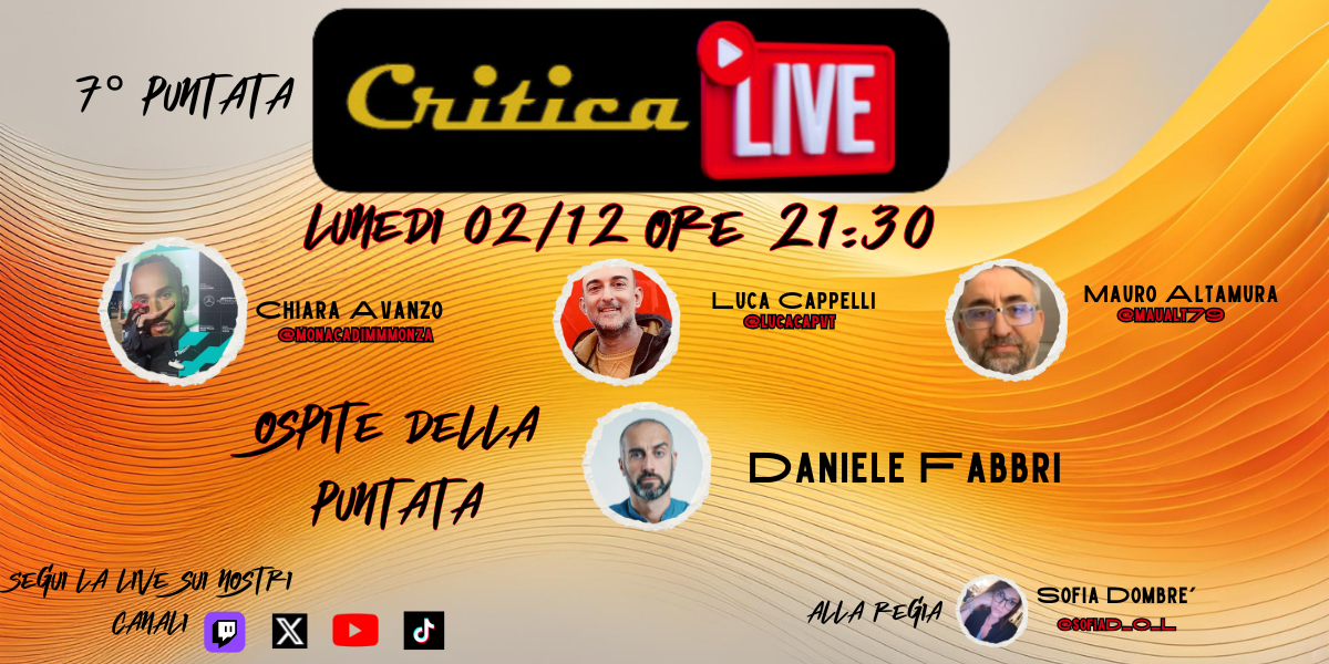Stasera alle 21:30, in diretta sui canali di Formulacritica: X, Twitch, Youtube e TikTok. Collegati per una serata di dibattito, ironia e analisi approfondite.