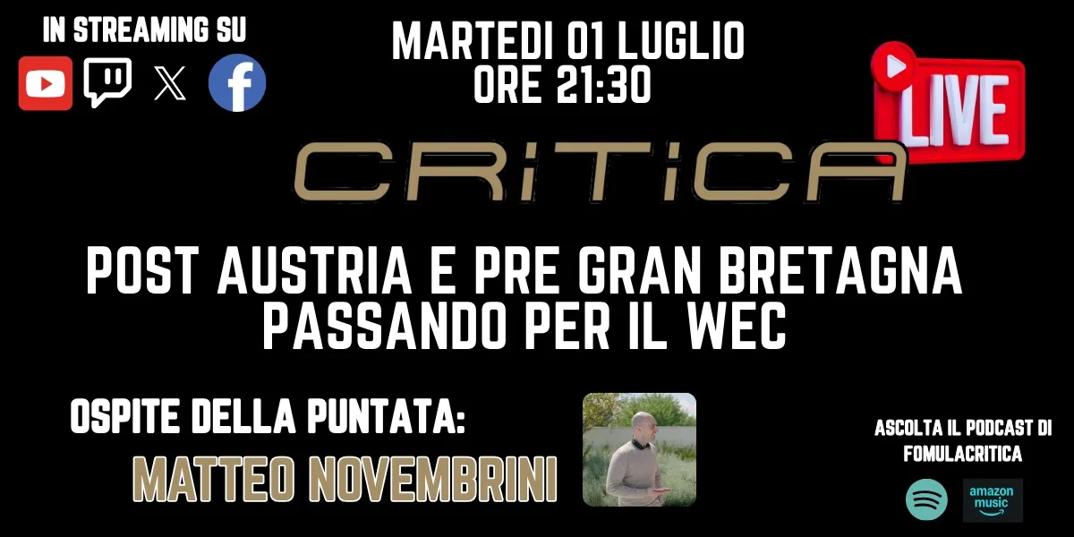 Stasera, martedì 1 luglio alle 21:30, su CriticaLive, analizzeremo il weekend austriaco e guarderemo verso Silverstone, dove Hamilton vivrà il suo primo GP di casa da ferrarista, in un clima che si preannuncia carico di emozione… e aspettative.