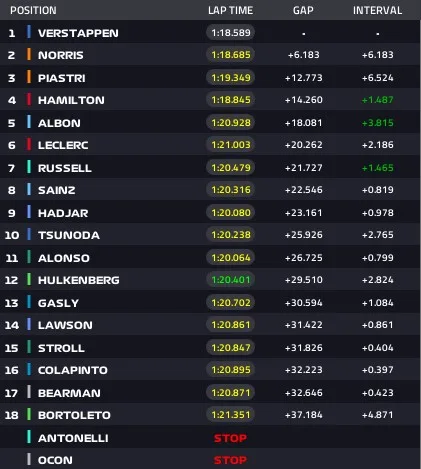 Al 14 si ferma Oscar Piastri che riparte in P12 davanti a Leclerc. Verstappen non replica, mentre si ferma Stroll. Dopo il balletto dei pit, alle spalle di Max c’è Norris a 10 secondi. Albon è terzo davanti ad Hadjar, Antonelli e Hamilton che, partito con hard, si trova in P6.