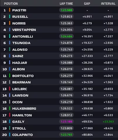 Allo spegnimento dei semafori. Piastri tiene bene, così come Russell e Norris. Tsunoda parte bene ma subito cede la posizione al compagno di squadra. Alonso cade in P6, Leclerc è disastroso visto che si ritrova in P13 dopo il primo giro.