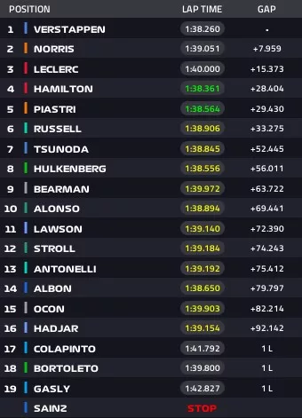 Allo spegnimento dei semafori Max mantiene la prima piazza mentre Leclerc supera Norris. Parte bene anche Hamilton che è quarto. Piastri quinto. Russell perde posizioni ed è sesto. AL giro 2 Sainz supera Bearman per la piazza n°8. Là davanti Verstappen allunga su Leclerc con Norris che si mette in zona DRS sulla SF-25 n°16.