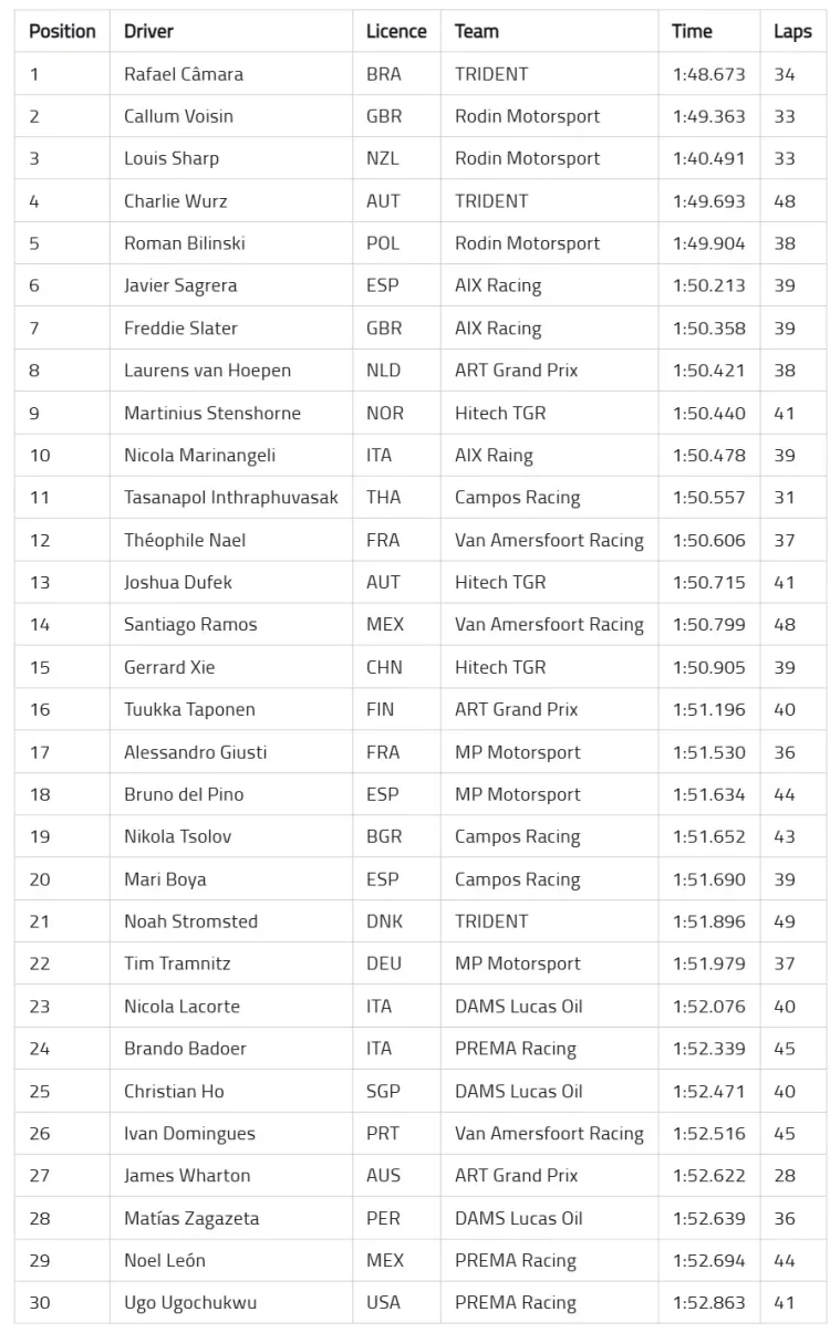 Dopo 45 minuti di sessione, è stata la scuderia Trident a prendere il comando con Câmara e Stromsted, che si sono piazzati rispettivamente in prima e seconda posizione. Successivamente, Tramnitz e Giusti si sono inseriti tra i due piloti della Trident.