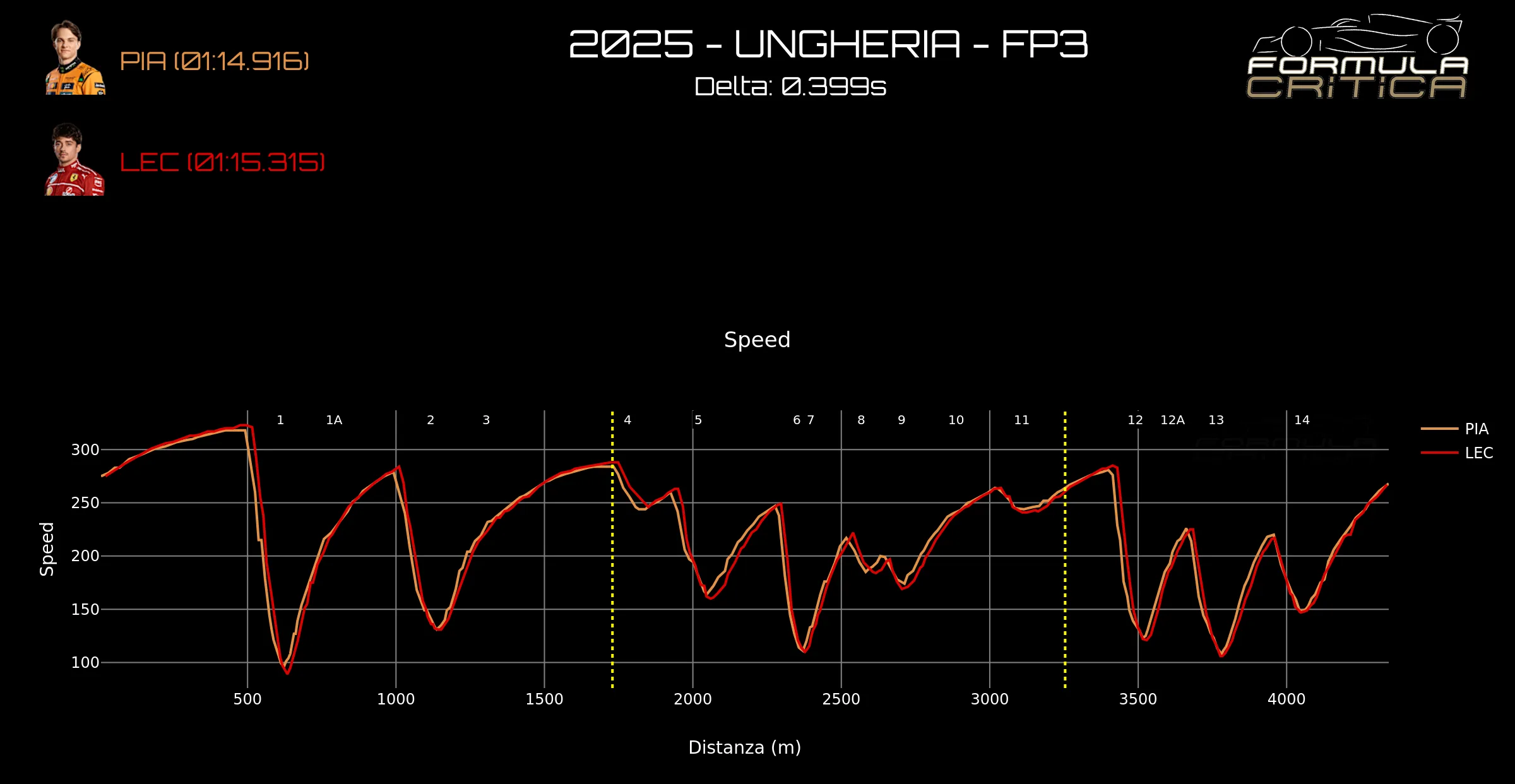 Oscar Piastri ha ottenuto il miglior tempo nella FP3 a Budapest (1:14.916), rifilando quasi quattro decimi a Charles Leclerc (1:15.315). Il grafico del miglior giro secco evidenzia con precisione dove e come la McLaren MCL39 guadagna terreno sulla Ferrari SF-25. Ecco una rapidissima comparazione pre-qualifiche (segui il live timing) supportata dal grafico a cinque parametri che potete trovare in basso.