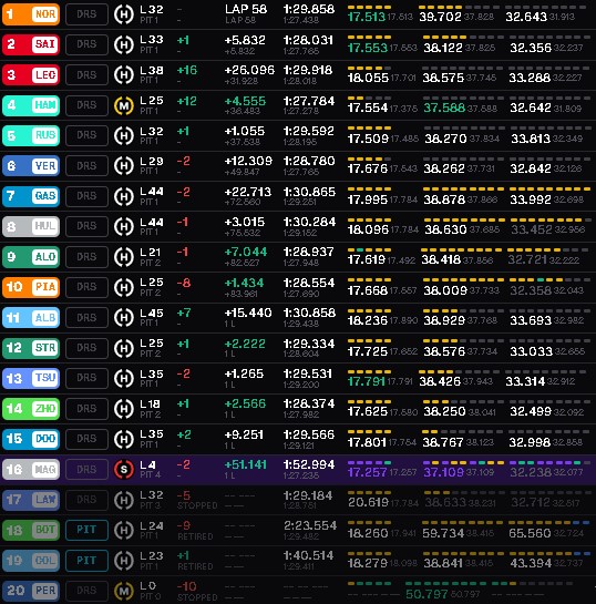 La gara riparte al terzo passaggio con Norris a guidare su Sainz, Gasly, Russell, Hulkenberg, Alonso, Magnussen, Leclerc, Stroll e Lawson. Piastri è diciottesimo al giro 4. L’australiano viene chiamato subito ai box per introdurre gomma hard.