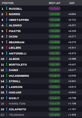 La seduta riparte a 18 minuti dal termine. Max si migliora: 1.24.116. McLaren alza la voce con Piastri che si issa in prima piazza col crono di 1.23.593. Fa meglio ancora Norris che segna un 1.23.338. Da segnalare un evidente unsafe release di Antonelli che, uscendo dal suo box, centra in pieno la Red Bull di Tsunoda. Arriverà certa penalità. Nel frattempo è Verstappen a prendersi la vetta, ma prima Norris e poi Russell gli “scippano” la P1.