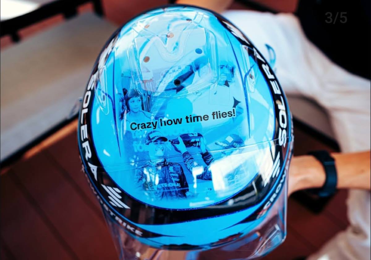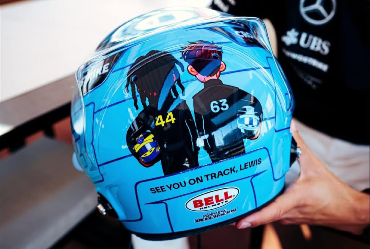 Il design del casco mostra una riproduzione dei due piloti visti di spalle, con la scritta “Ci vediamo in pista, Lewis” sul retro. Sulla parte superiore, invece, ci sono due immagini: una ritrae un Russell bambino, con uno sguardo estasiato e incredulo mentre guarda Hamilton, già campione, e l’altra mostra i due piloti anni dopo, insieme sul podio a festeggiare, con la frase “Pazzesco come il tempo vola”.