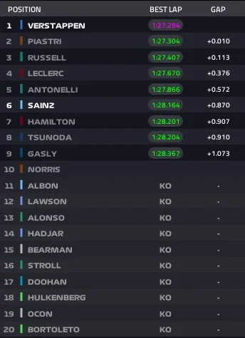 A partire al palo sarà Max Verstappen su Red Bull col tempo di 1.27.294. Alle sue spalle Oscar Piastri. Chiude il podio virtuale un sontuoso George Russell che condivide la seconda fila con Charles Leclerc.