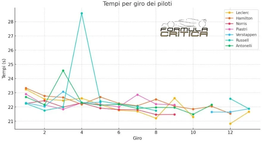 Registriamo che la Ferrari SF-25 si è presentata con una configurazione alare posteriore più carica rispetto alla concorrenza, una scelta che potrebbe rivelarsi utile se, come sembra, dovesse piovere domenica. Ma andiamo a vedere quali sono i numeri emersi dalla pista.