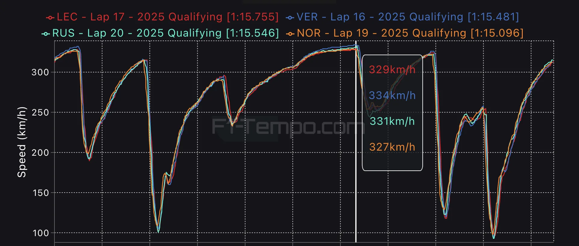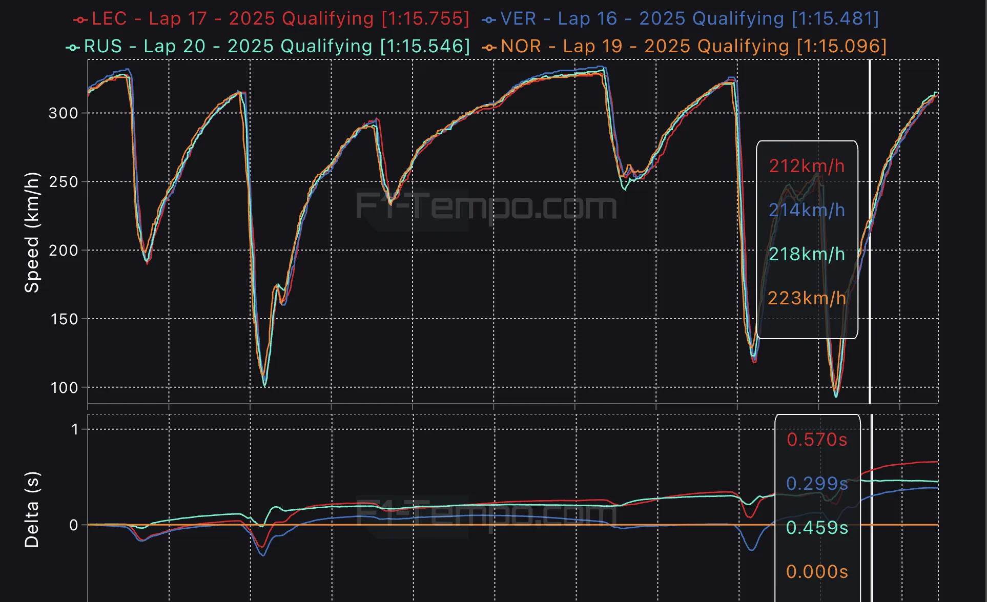 I tempi presi in analisi sono quelli fatti registrare nel Q3 da Norris, Verstappen, Russell e Leclerc. Analizzando le telemetrie, il primo dato a emergere è la velocità della Red Bull di Verstappen nei rettilinei che portano a curva 1 nel primo settore, e a curva 9-10 nella fine del secondo settore, sintomo di una RB21 molto più scarica rispetto ai rivali. Il solito Max ha messo una pezza a un mezzo che ieri era andato in completa difficoltà, anche se comunque non si può non menzionare il fatto che ancora una volta il lavoro al simulatore ha dato i suoi frutti.