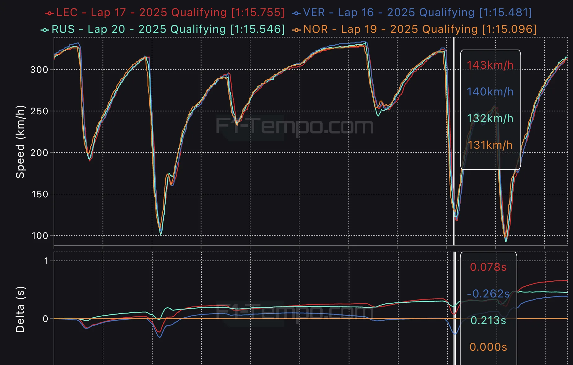 Il sottosterzo della SF-25 ha probabilmente rovinato il giro del monegasco proprio in curva 14. Come potete vedere dall’ultimo grafico, dopo questo punto dolente, la Ferrari ha lasciato per strada molti decimi importanti, con il conseguente risultato di una triste settima posizione in griglia che andrà a complicare la gara del ferrarista domani.