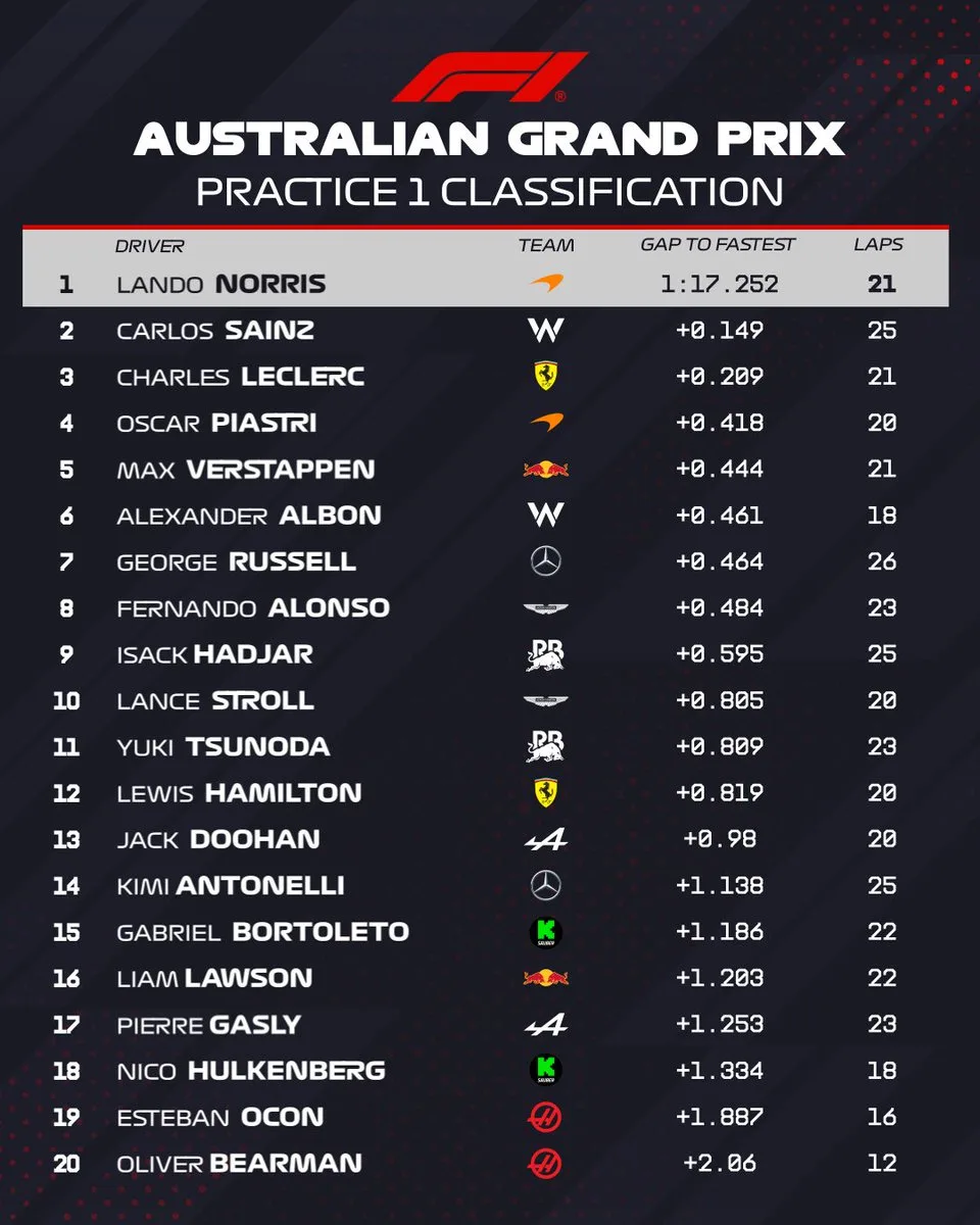 Gp di Australia 2025, risultati FP1 – Si è da poco conclusa la prima sessione di prove libere del GP di Australia di Formula 1, che ha segnato non solo l’inizio ufficiale del campionato, ma anche l’esordio di Hamilton in Ferrari, Sainz in Williams e dei rookie con le rispettive squadre.