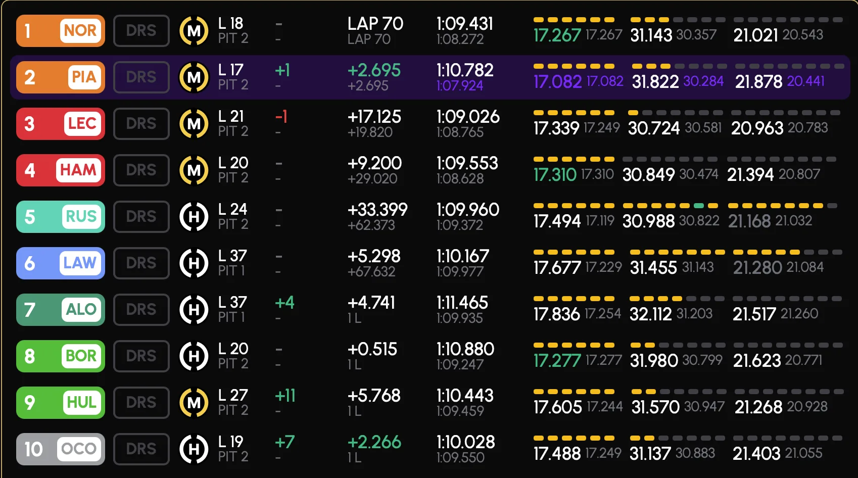 Nel giro 6 Piastri inizia a farsi vedere negli specchietti del #4, che tende a gestire la gomma. I due per ora, si attaccano sui giri veloci, con questa prima fase che tende a favorire l’inglese, complice anche l’aria pulita che ha davanti. Il suo scopo, è togliere il DRS al team mate, in modo da allungare il distacco.
