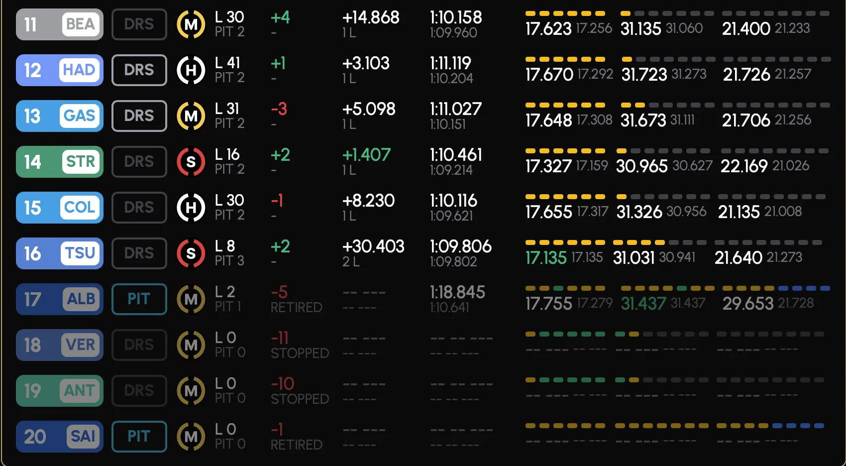 Al giro 30 Gasly lamenta mancanza di grip aprendosi via radio, affermando che rischia di perdere la monoposto ad ogni curva. Poco dopo, Tsunoda prova un sorpasso su Colapinto, ma per mancanza di spazio, la ruota posteriore dell’argentino si scontra con l’anteriore del #22, andando in testa coda. Possibile penalità per il pilota Red Bull.