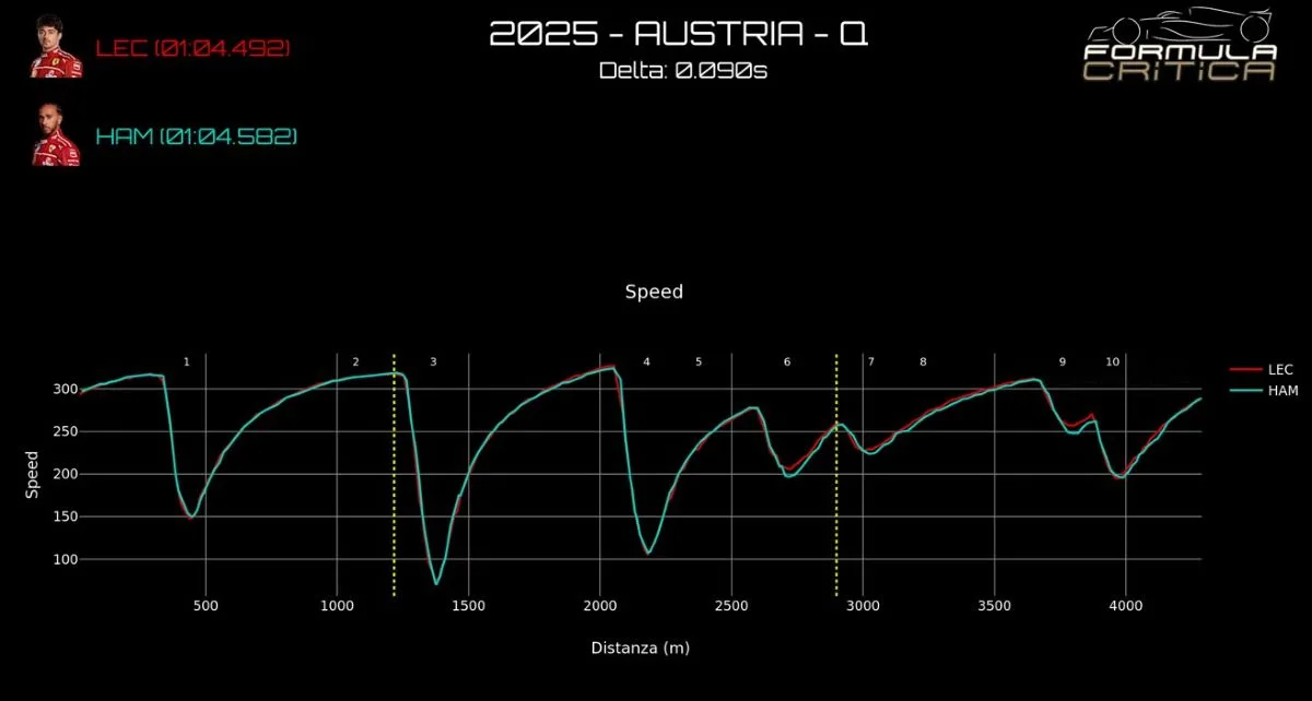 Gp Austria 2025 – Il Red Bull Ring, con le sue dieci curve distribuite su 4,3 km, è una pista che premia la trazione, la stabilità in frenata e la capacità di generare rapidamente temperatura nei pneumatici. L’analisi comparativa tra il giro secco di Charles Leclerc (P2 in 1:04.492) e quello di Lewis Hamilton (P4 in 1:04.582) offre uno spaccato tecnico preciso su come i due alfieri Ferrari interpretino la SF-25 in maniera profondamente diversa. Per il confronto tra Leclerc e il poleman Lando Norris è fruibile a seguente link: clicca qui.