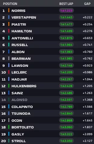 10:53 – Norris mette il muso davanti a tutti: 1.43.640. Alle sue spalle Antonelli.