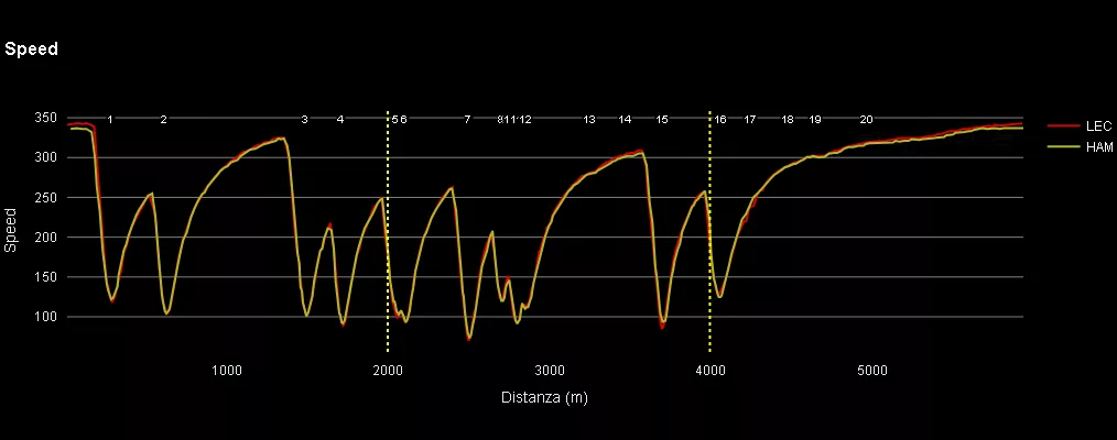 Il confronto diretto tra i giri veloci di Hamilton (1:41.293) e Leclerc (1:41.259) mette in evidenza la frenata come punto discriminante. Lewis è stato più incisivo e modulato nello scarico del pedale, riuscendo a portare la staccata più dentro la curva senza compromettere la stabilità dell’anteriore. Il grafico delle velocità (comparazione in alto) mostra come il britannico mantenga velocità minime superiori in diversi punti del tracciato, con un guadagno netto soprattutto alla curva 15, dove sfrutta il carico aerodinamico extra per affrontare la discesa con 8 km/h in più del compagno.