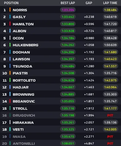Negli ultimi quindici minuti si vedono le gomme soft. Scelta che non caratterizza tutti i 20, soprattutto i rookie. Evidentemente i team intendono evitare problemi in vista del rientro dei titolari. Alla fine di una sessione veramente povera di elementi da analizzar emerge la McLaren di Lando Norris che precede Pierre Gasly. Lewis Hamilton ottiene la terza piazza ma le indicazioni sul nuovo fondo non sono ancora valutabili a causa di una pista poco indicativa.