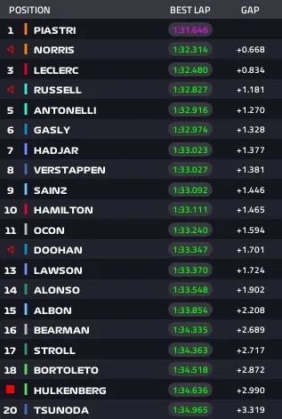 Con l’ultimo treno di soft riemerge la McLaren. Piastri si prende la testa con un mostruoso 1.31.646. Norris, invece, alza il piede e rientra ai box dopo aver commesso un errore nel T1. Il britannico riscende in pista e piazza il secondo crono di giornata. Leclerc, terzo, becca un gap di oltre otto decimi. Hamilton è solo decimo e continua a non trovare la quadratura del cerchio con la sua vettura. Difficoltà anche per la Red Bull che vede uno Tsunoda fanalino di coda e un Max solo ottavo.