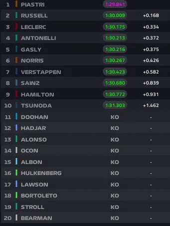 A partire al palo sarà Oscar Piastri su McLaren col tempo di 1.29.841. Alle sue spalle George Russell. Chiude il podio virtuale un grande Charles Leclerc. Male Lando Norris, solo sesto, che tiene dietro Max Verstappen che non replica il miracolo nipponico. Male anche Hamilton che chiude con un mesto nono posto.
