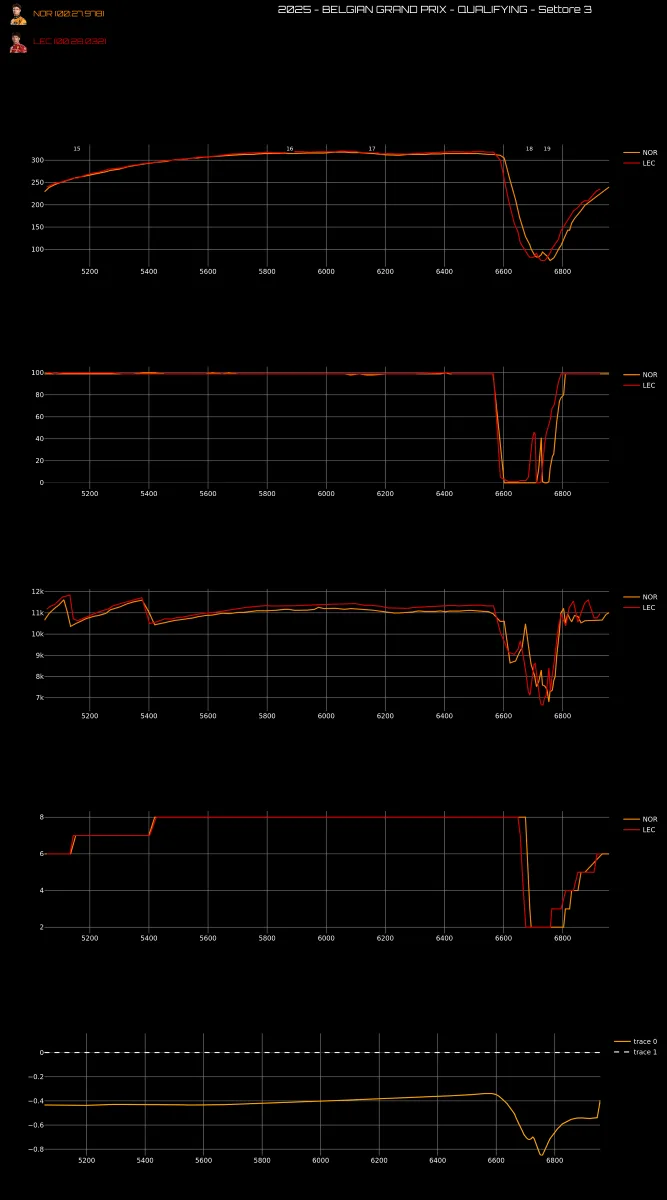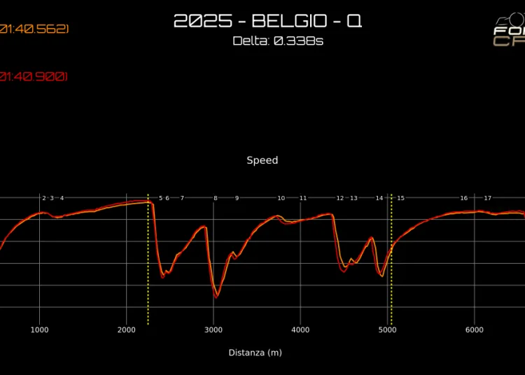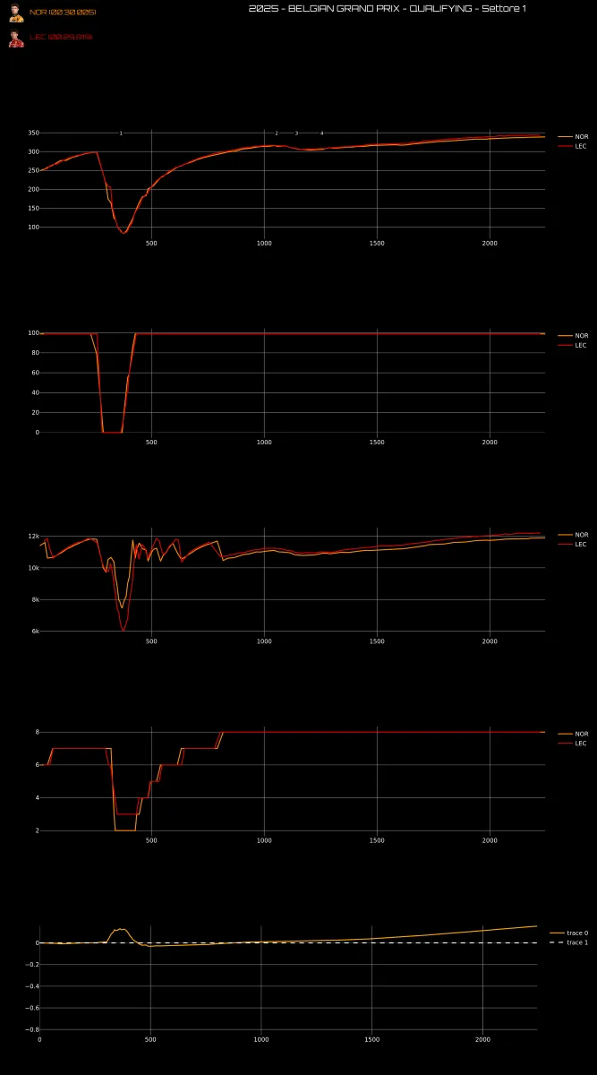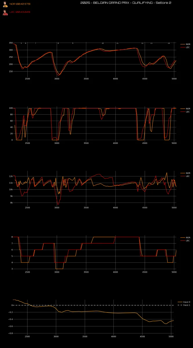 Il confronto telemetrico tra il pilota McLaren e quello Ferrari, separati da 0.338 secondi, evidenzia due approcci differenti nella gestione del giro secco, frutto di filosofie tecniche distinte e di strategie di guida calibrate sulla natura ondulata e variegata del tracciato belga.