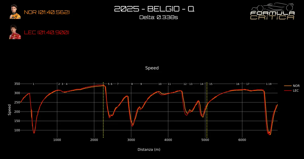 Il grafico della velocità racconta di un Norris capace di costruire la sua prestazione su una gestione fluida, in particolare nei tratti ad alta velocità come Eau Rouge-Raidillon, Kemmel Straight e il tratto che porta a Blanchimont. Pur avendo una velocità di punta molto simile a Leclerc, è la maggior costanza nei tratti intermedi ad aver permesso al pilota McLaren di guadagnare decimi preziosi.