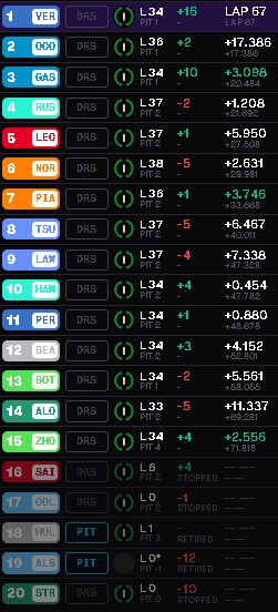 Al giro 32 Colapinto, provando a chiudere il gap dopo la sua sosta, la mette a muro causando bandiera rossa. Gara congelata al giro 33.