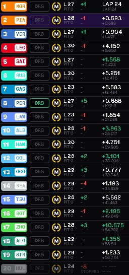 In McLaren non giocano di strategia con Piastri che fa la sua gara senza, per ora, lavorare per il compagno di squadra. Vediamo se nel finale arriva l’ordine di scuderia.
