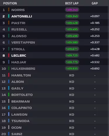 A partire al palo sarà Lando Norris col tempo di 1.09.243. Alle sue spalle un grande Andrea Kimi Antonelli staccato di soli 97 millesimi. Chiude il podio virtuale Oscar Piastri. Russell è quarto, davanti ad Alonso. Molto positiva la AMR25 considerando che Stroll è in P7. Delude Verstappen, solo sesto. Peggio fa la Ferrari di Leclerc, ottavo alla bandiera a scacchi.