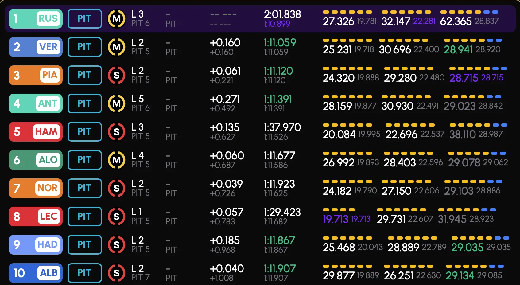 Leclerc abortisce il giro e rientra ia box. Partirà ottavo. Prima Piastri, poi Verstapen e poi Russell, con il #63 che ottiene la prima pole stagionale in 1’10’899.