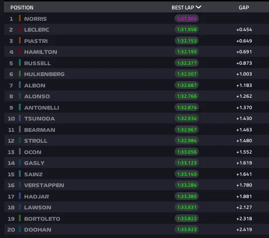 Fuori dai primi dieci, Bearman ha chiuso 11°, seguito da Stroll, Ocon, Gasly e Sainz, mentre Verstappen si è ritrovato solo 16° dopo aver abortito il suo giro veloce con gomma morbida, senza dunque registrare un tempo rappresentativo. Alle sue spalle Hadjar, Lawson, Bortoleto e Doohan, quest’ultimo fermo per problemi tecnici.