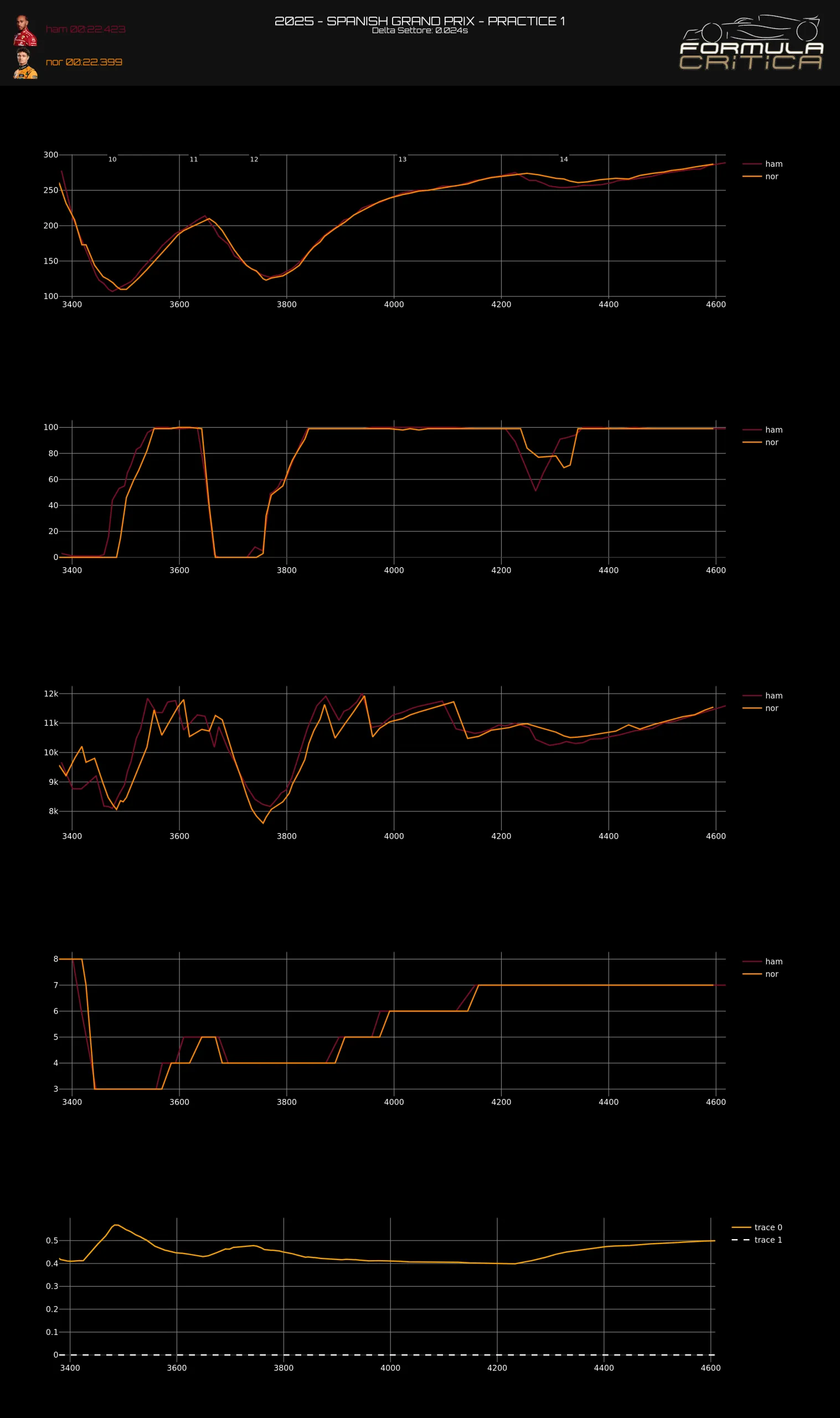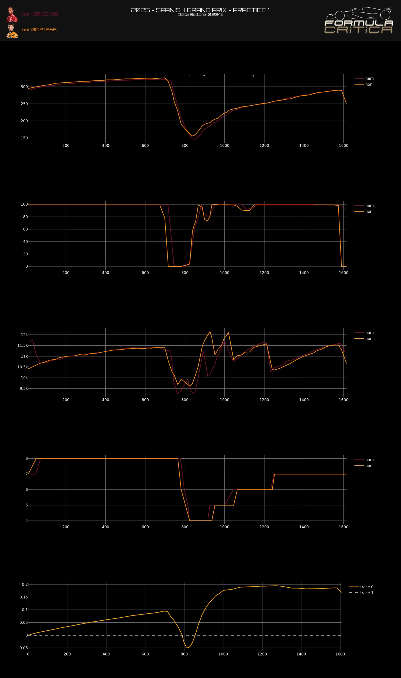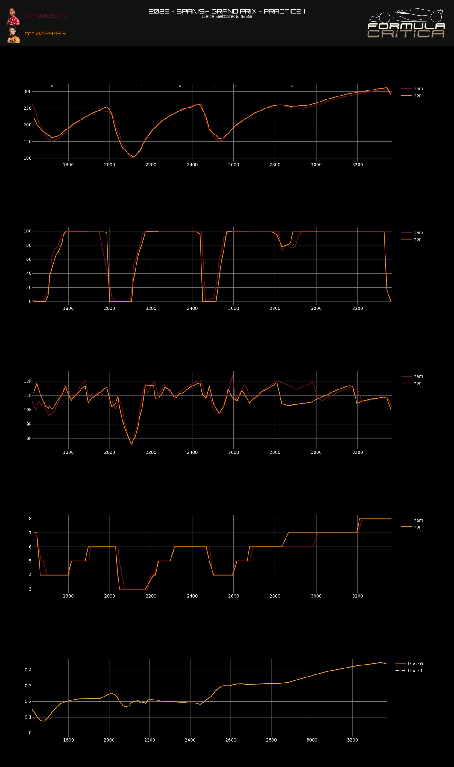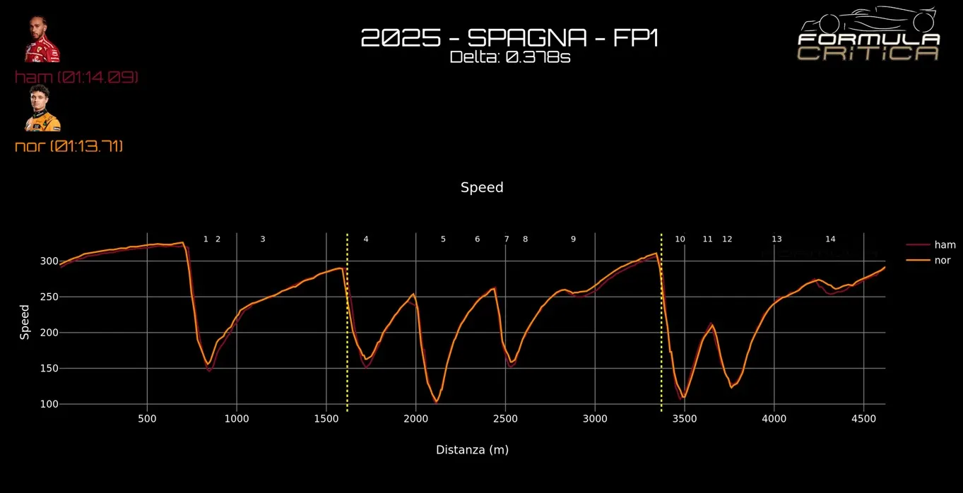 La prima sessione di prove libere del GP di Spagna 2025 (qui i risultati completi) ha fornito i primi, seppur parziali, spunti tecnici utili a comprendere gli equilibri tra le principali vetture in pista. A svettare sul cronometro è stato Lando Norris (1.13.718), ma è dall’analisi dettagliata dei dati – in particolare attraverso il grafico della track dominance – che emergono osservazioni interessanti sul comportamento delle monoposto.