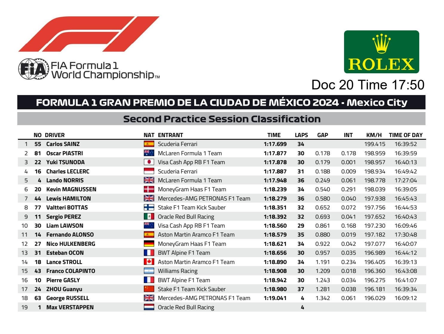Gp Messico 2024, ecco la lista dei tempi della seconda sessione di libere durata novanta minuti per permettere alla Pirelli e ai team di testare le gomme. Problemi alla pover unit della Red Bull di Max Verstappen che fa solo quattro giri. Bene la Ferrai con Sainz che precede Piastri nonostante una mescola di svantaggio. Ottimo il passo gara sciorinato dalla SF-24.