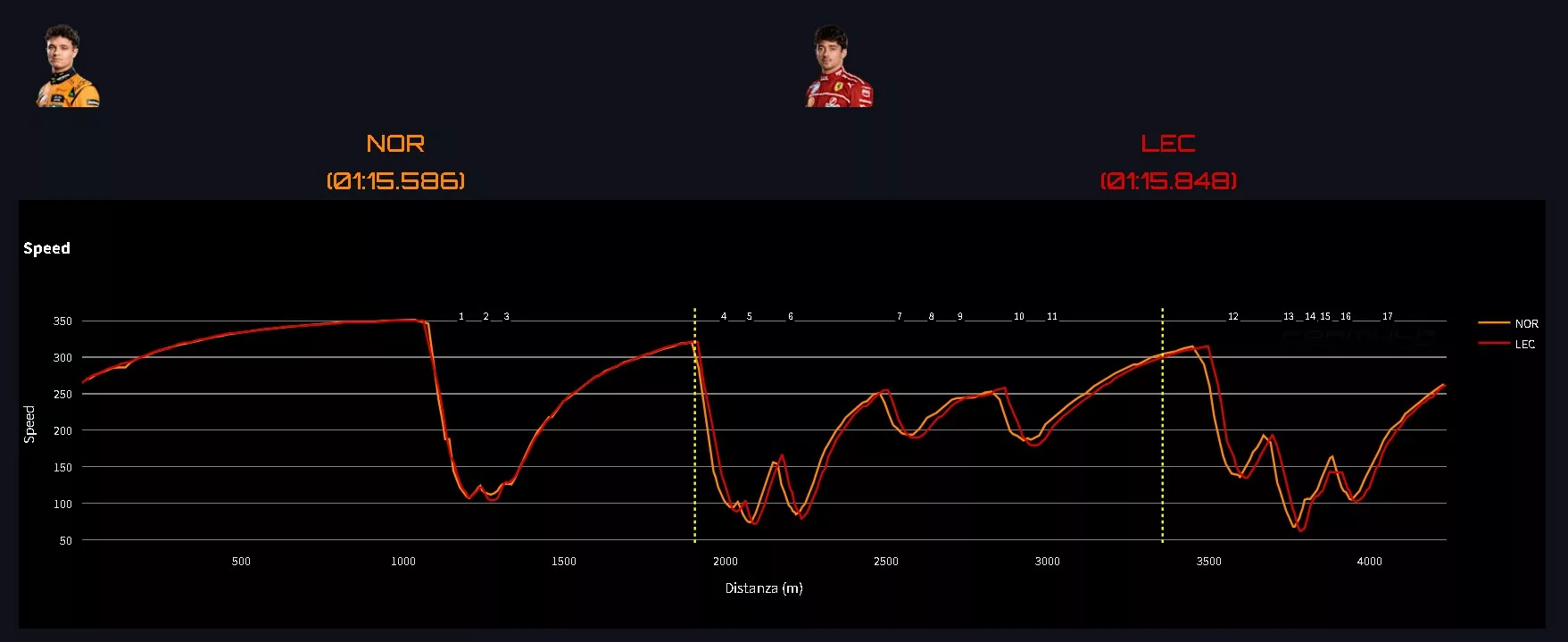 In definitiva, la differenza tra Norris e Leclerc non risiede nella velocità pura, ma nella qualità dell’erogazione e nella rapidità di applicazione del gas nei tratti di media velocità. La McLaren è riuscita a ottenere una finestra di funzionamento aero-meccanico ideale, mentre la Ferrari, pur velocissima nel lento, ha sofferto un piccolo squilibrio tra l’anteriore e il posteriore nei cambi di direzione più rapidi.