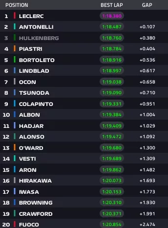 A 20 minuti dal termine Piastri torna in pista con gomma hard. Iniziano i test con serbatoi più carichi. Subito dopo Leclerc mette il naso sull’asfalto con la stessa mescola. Solo due giri per sgrossare la hard, poi il monegasco ritorna in pista con le soft. Mentre i McLaren prova il passo gara si fa vedere Lindblad in P6 con gomma C5. Il migliore dei nuovi nella giornata odierna.