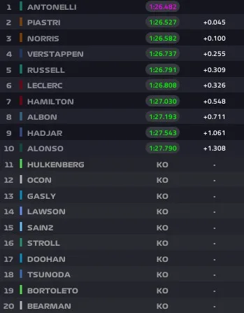 Risultati Qualifica Sprint Gp Miami 2025. Definita la griglia di partenza della Sprint Race a seguito delle qualifiche del secondo weekend sprint del Campionato del Mondo di F1. Scatterà in pole position Andrea Kimi Antonelli su Mercedes che ha girato in 1.26.482. Alle sue spalle il duo McLaren con Norris davanti a Piastri. Ferrari anonima in sesta e settima piazza con Leclerc e Hamilton.