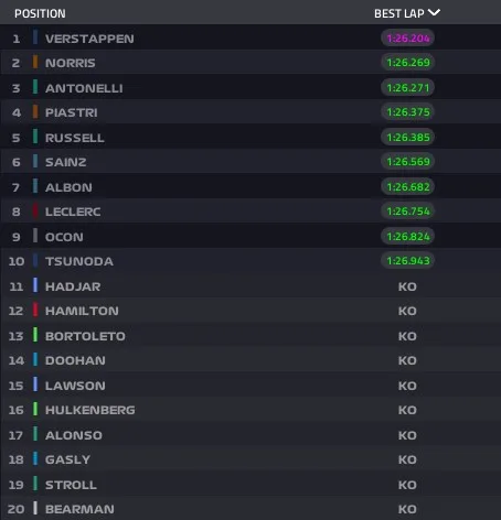A partire al palo sarà Max Verstappen su red Bull col tempo di 1.26.204 che è anche il nuovo record della pista. Alle sue spalle Lando Norris. Chiude il podio virtuale un grande Andrea Kimi Antonelli che condivide la seconda fila con Oscar Piastri.