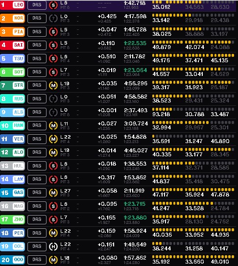 Nel finale di sessione, dopo programmi di lavoro veramente difficili da comprendere e dai quali, in ogni caso, sono emerse le Ferrari, sono apparse le gomme soft per qualche tentativo push. A serbatoi scarichi si conferma la SF-24 di Leclerc che si mette davanti alle due McLaren che sono staccate di poco più di un decimo. Sainz è a sette decimi di secondo dal battistrada. Sembra confermarsi lotta a due per la vetta, me è troppo presto per tirare le somme.