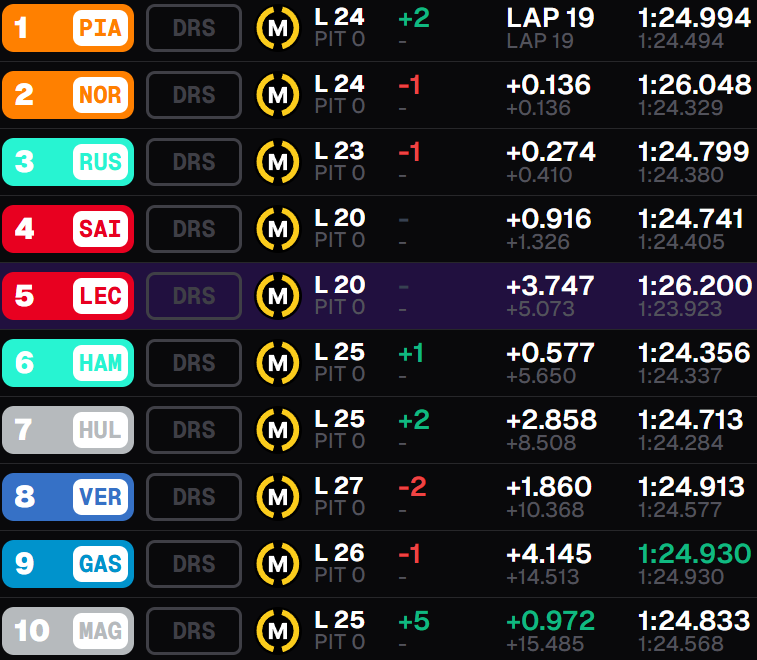 Una sprint race molto cauta da parte di tutti i piloti, in particolare McLaren. Il duo papaya, dopo un’ottima partenza, ha fatto un eccellente lavoro di squadra, con Norris in prima posizione che non ha mai tentato l’allungo, con l’obiettivo di garantire a Oscar Piastri il DRS, fondamentale per difendersi dalle incursioni di George Russell, il quale completa il podio di questa sprint race. Clamoroso il finale, con Norris che cede la vittoria al compagno Piastri.