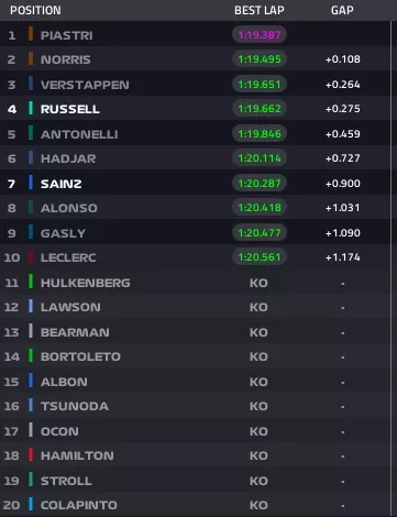 A partire al palo sarà Oscar Piastri col tempo clamoroso di 1.19.387. Alle sue spalle Lando Norris che continua a gestire evitando di dilapidare il buon vantaggio in classifica. Chiude il podio virtuale un sempre solido Max Verstappen. Al suo fianco George Russell. Male Leclerc, solo decimo.