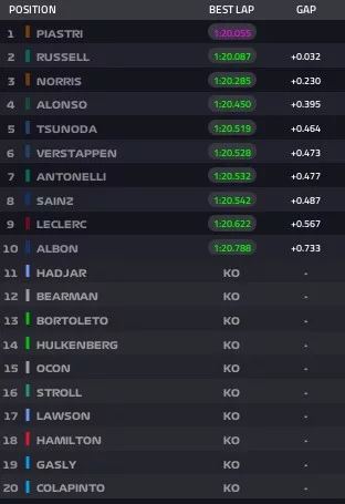 A partire al palo sarà Oscar Piastri col tempo di 1.20.055. Alle sue spalle George Russell che precede un guardingo Lando Norris che pensa a non sbagliare. Verstappen è solo sesto preceduto per la prima volta nel push lap da un ottimo Tsunoda. MVP di giornata è Fernando Alonso che chiude in quarta posizione. Maluccio Leclerc, solo nono.