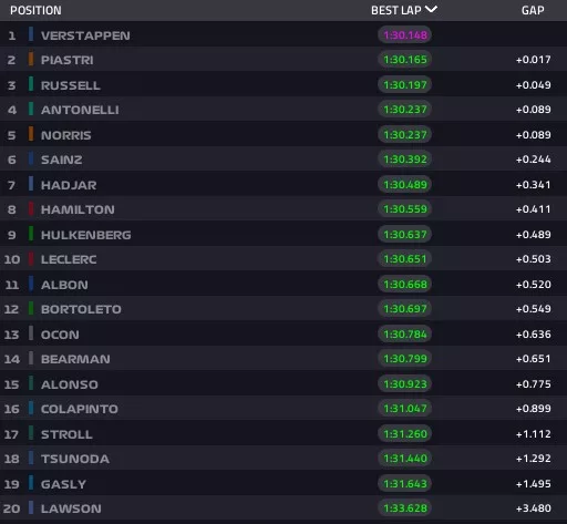 Si vedono le gomme soft. Antonelli, dopo un venerdì anonimo, sale nella temporanea prima posizione col crono di 1.30.760. Russell è meno efficace e chiude in P4, destinato a perdere posizioni quando gli altri completeranno i giri push.