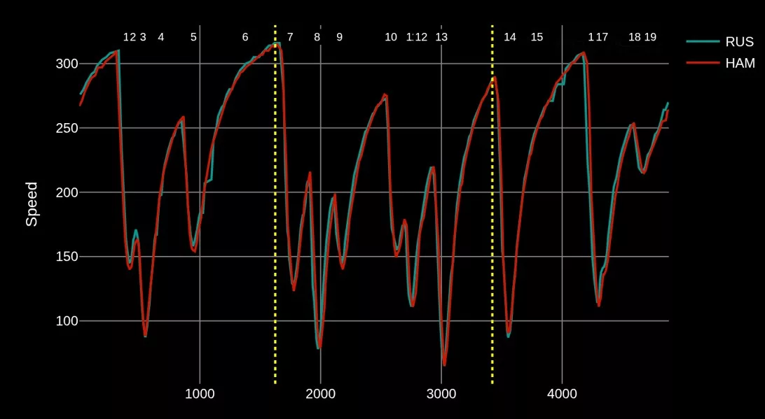 È interessante notare anche l’uso dei rapporti (nGear): Russell sfrutta una mappatura più corta in seconda e terza, che gli consente di avere più spinta ai regimi bassi, mentre Hamilton tende a rimanere in marcia più alta per ridurre lo slittamento. Una scelta obbligata, indice di una macchina più sensibile al posteriore.