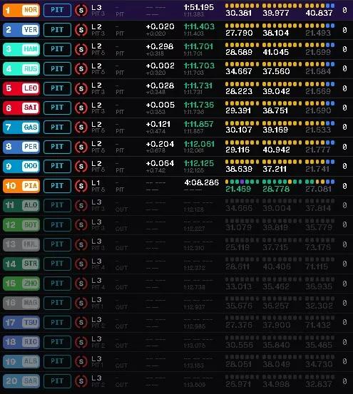 Alle sue spalle Max Verstappen su Red Bull. A completare il podio virtuale è un immarcescibile Lewis Hamilton che precede il compagno di squadra a sancire il ritorno della Mercedes.