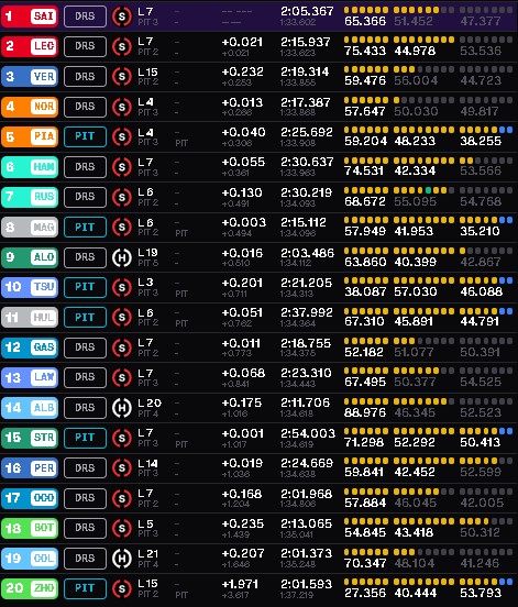 I primi a montare gomma soft sono i due della Red Bull. Come prevedibile Max Verstappen si issa in testa alla lista dei tempi in attesa che altri usino la C4. Gli altri proseguono con la hard simulando il passo gara. McLaren si distingue come al solito, ma la Ferrari è lì e a tratti sembra anche essere più efficace.