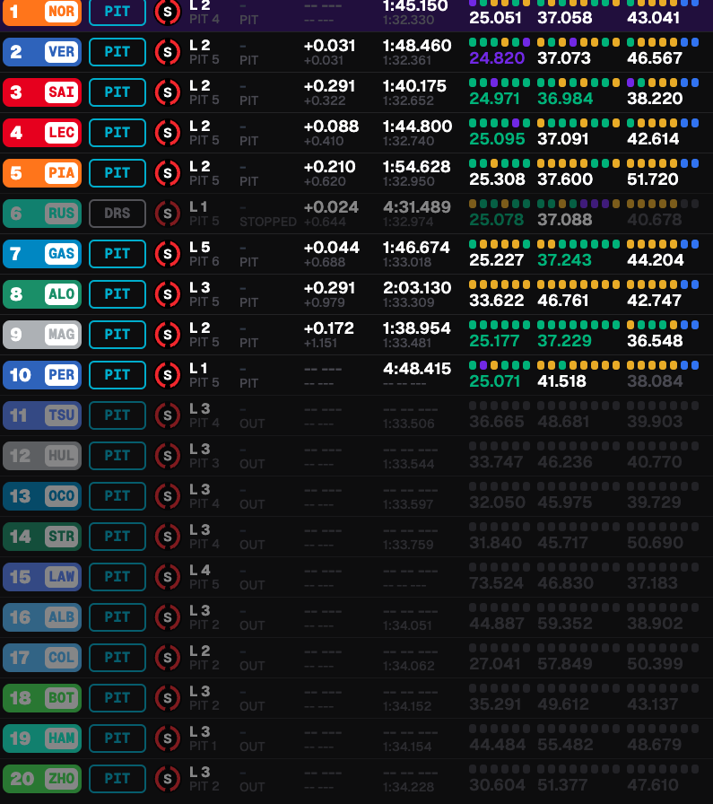 Scatterà in pole position Lando Norris, con un tempo di 1.32.330. Alle sue spalle Max Verstappen, il cui secondo tentativo in Q3 è interrotto prematuramente da una bandiera gialla causata da George Russell nel T3. Seconda fila per i ferraristi Sainz e Leclerc.