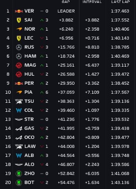 Norris sembra averne nelle prime battute e si mette in zona DRS su Verstappen che non riesce a scappare via. Il duello tra le due Rosse si protrae e al passaggio n°5 Sainz ha la meglio su Leclerc. Nel frattempo Max riesce ad aprire un piccolo margine mentre Russell minaccia Norris che non ha DRS.