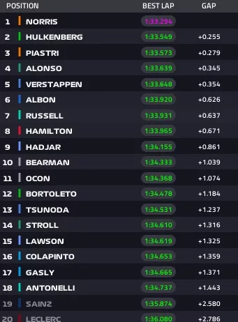A emergere dai giri push (ai quali non partecipa Leclerc per un problema al cambio della SF-25) è la McLaren di Norris che si piazza davanti a un grande Hulkenberg. Terzo Oscar Piastri che precede il sorprendente Aston Martin di Alonso. La forza della MCL39 è nel T3 dove riesce ad arrivare in una buona finestra operativa, cosa non comune a tutti.